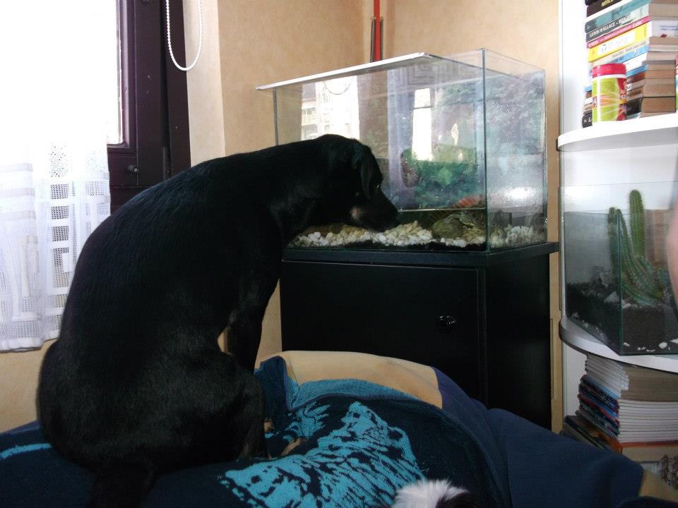 Látogatást tettünk Dávidéknál, ahol kiderült Menta oda van a teknősökért és a halakért is! Rendületlenül ült az akváriumok előtt és meredten bámulta őket! Gondoltuk Déviddal: Mi lenne ha közelebbről is megszemlélhetné a teknőst? Ebben természetesen jóbarátja Szutyi segített neki!